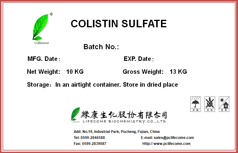 Both compacted non-sterile colistin sulfateand fine powdered non-sterile colistin sulfatecompliedwith EP 9.0(≥19,000 IU/mg) are available. Each product has three different package sizesof 2 kg, 5 kg, and 20 kg.